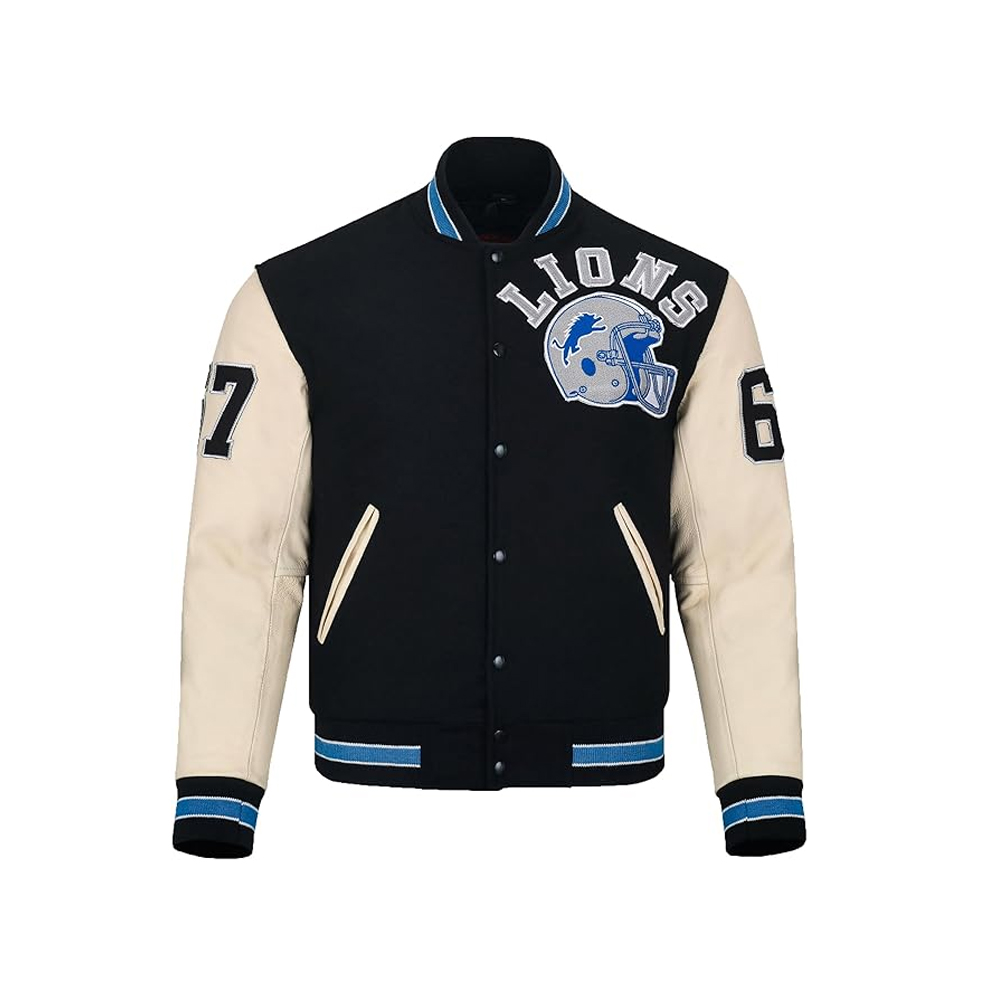 A varsity jacket, also known as a letterman jacket, is a classic sporty jacket that symbolizes school or team spirit. It typically has a wool body with contrasting leather sleeves, giving it a bold two-tone look. The front often features chenille letters, patches, or logos representing a school, team, or achievement. Varsity jackets have ribbed collars, cuffs, and waistbands with striped designs for a sporty finish. They usually include snap-button closures and side pockets for practicality. Popular in both athletics and fashion, varsity jackets blend comfort, style, and tradition.